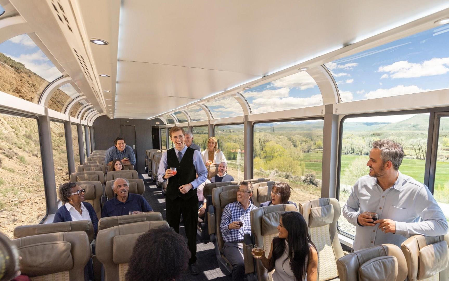 Gaze upon sweeping landscapes through expansive panoramic windows as you relax in spacious seats designed for your utmost comfort, then step out onto an outdoor viewing area and breathe in the fresh air.